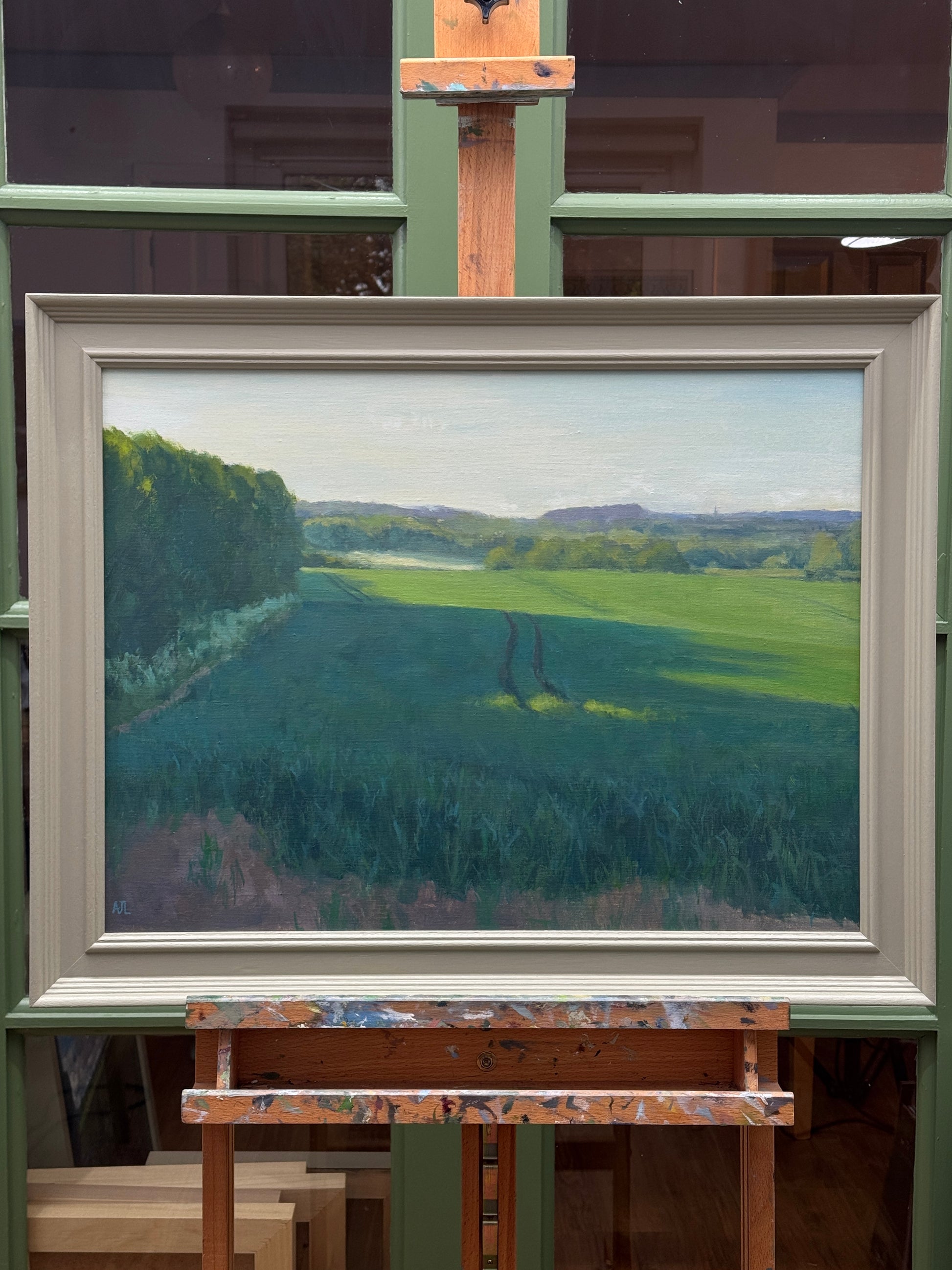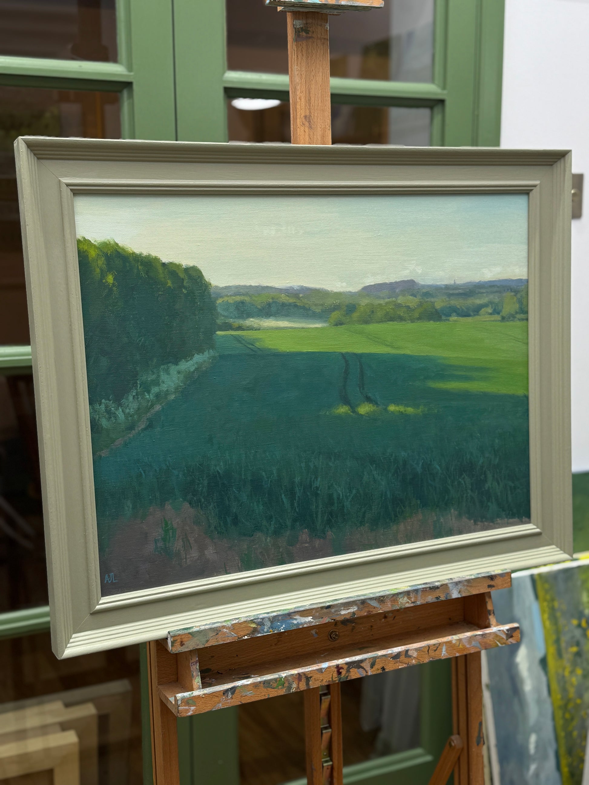 An original en plein air painting exploring the green tones of the Oxfordshire countryside just outside of Witney. The gentle slope of the field, curved tyre tracks cutting through the crops, and soft shadows combined to create a calm spring scene.